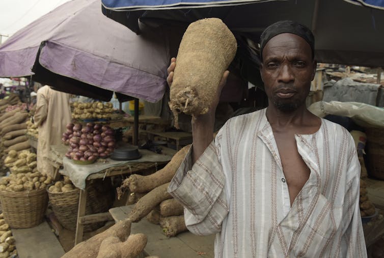 A vendor holds a tuber of yam for sale at the popular Mile 12 market in Lagos.